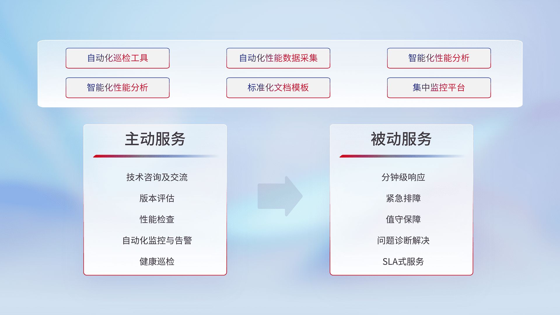 智能化工具和标准化文档,,,,保障服务质量,,,提供主动服务(包含技术咨询、、、版本评估、、性能检查、、、自动化监控与告警、、、、健康巡检)和被动服务包含(分钟级响应、、、、紧急排障、、、值守保障、、问题诊断解决、、、、SLA服务)。。